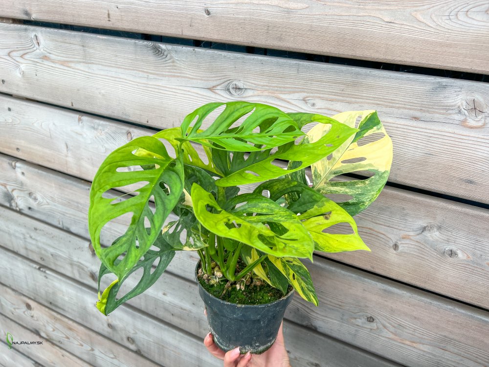 Monstera adansonii 'Aurea Variegata' je vzácna a pôsobivá odroda, známa svojím výrazným žltým panašovaním na tmavozelených listoch. Tento kontrast vytvára exotický a luxusný vzhľad, pričom veľké vykrojené listy môžu dorásť do výrazných rozmerov, čo z nej robí výnimočný prvok každého interiéru.