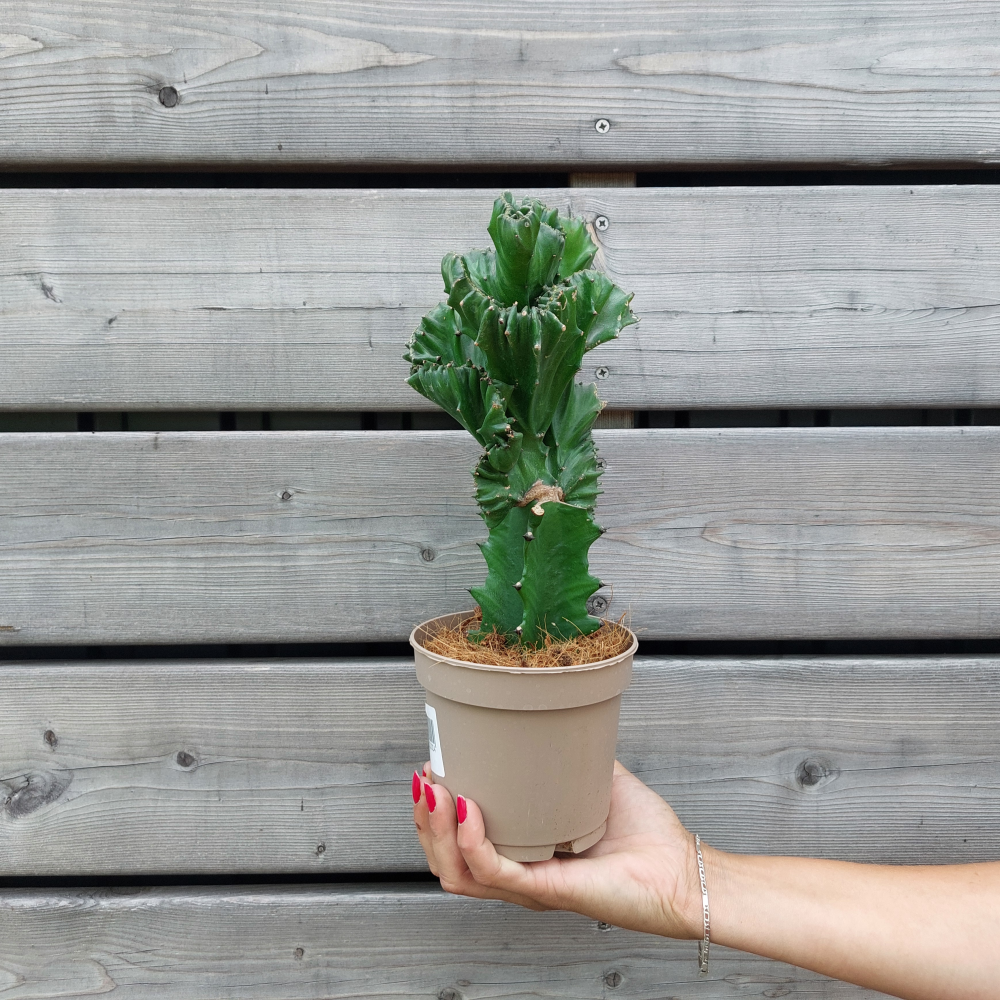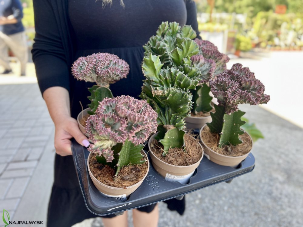 Euphorbia lactea ´CRISTATA´, známa aj ako hrebeňovitý mliečnik, je výrazná sukulentná rastlina s netradičným vzhľadom pripomínajúcim koraly alebo vejárovito zvlnený hrebeň. Tento tvar je výsledkom prirodzenej mutácie, pri ktorej sa rastový bod rastliny deformuje a vytvára dekoratívnu vrchnú časť v tvare vejára. Často je naštepená na zelený, rovný kmeň iného druhu mliečnika, ktorý jej zabezpečuje stabilitu a výživu. Farebnosť vrchnej časti sa môže pohybovať od sivozelenej až po ružovkastú s rozmanitými okrajmi a vzormi, čo závisí od konkrétneho kultivaru. Euphorbia lactea ´CRISTATA´ je obľúbená medzi zberateľmi sukulentov a kaktusov, no zároveň vynikne ako dekoratívny solitér v interiéri aj v moderných aranžmánoch. Je nenáročná na pestovanie, vhodná do dobre priepustného substrátu pre sukulenty a najlepšie sa jej darí na svetlom mieste s rozptýleným svetlom. Táto rastlina je ideálnou voľbou pre milovníkov netradičných a zaujímavých rastlín.