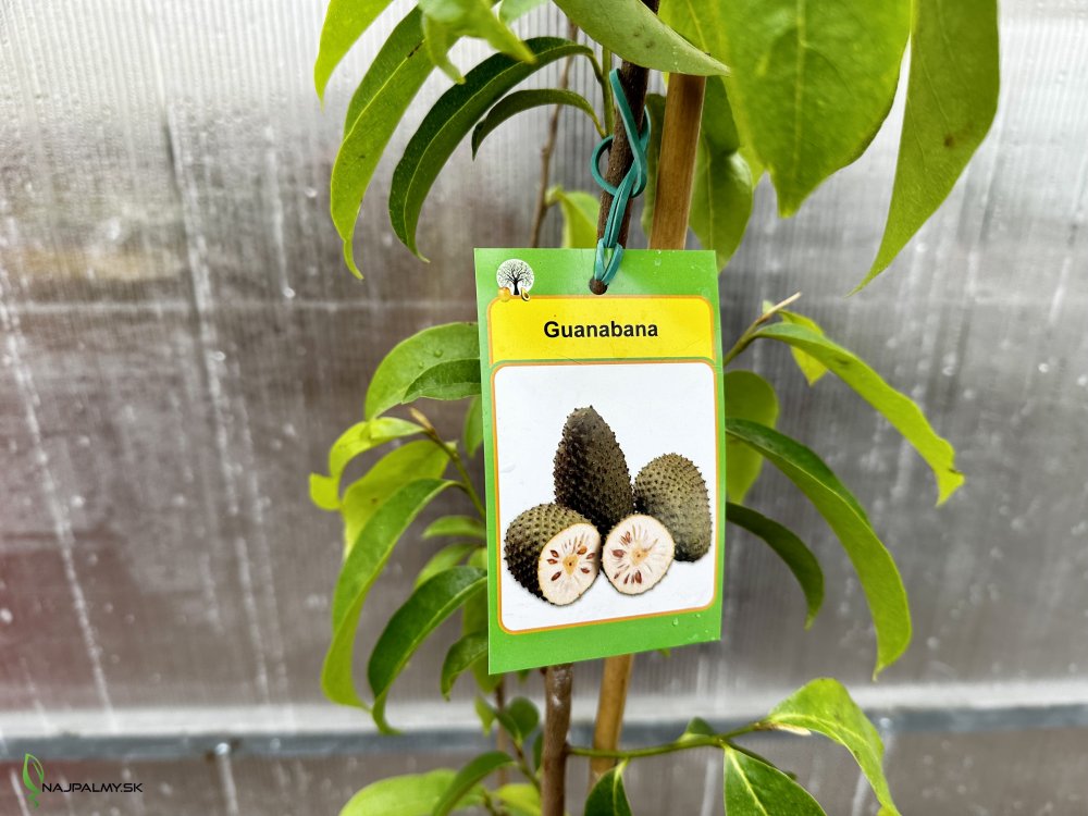 Guanabana je tropický strom pochádzajúci z Južnej Ameriky. Má zaujímavú kôru s jemnými trblietavými bodkami. Atraktívne listy sú lesklé, kožovité, eliptického tvaru. Začína kvitnúť na jar, alebo začiatkom leta krásnymi žlto-bielymi kvetmi s intenzívnou vôňou. Guanabana má oválne plody s mäkkou dužinou bielej až ružovej farby, obklopené čiernobielymi semenami. Majú jemne sladkú chuť s ľahkým kyslým podtónom. Používajú sa prípravu džemov, džúsov, zmrzliny a dezertov. Táto tropická rastlina preferuje teplé a vlhké prostredie s priepustnou, vlhkou pôdou. Potrebuje pravidelnú zálievku najmä počas zrenia plodov.