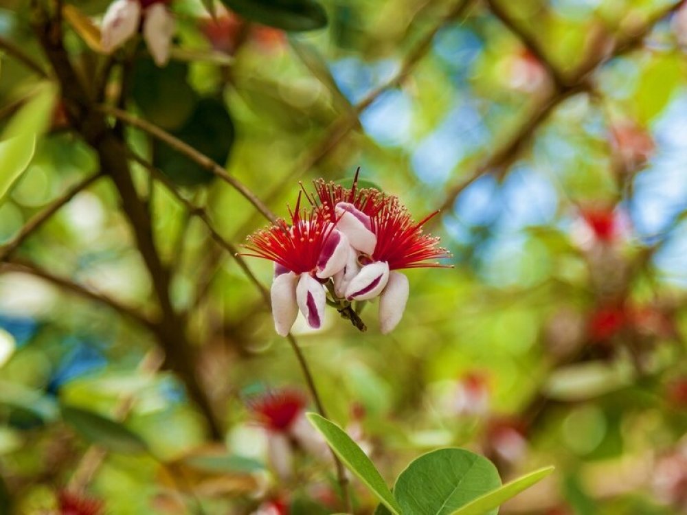 Acca Sellowiana Feijoa, známa tiež pod názvom Feijoa, je fascinujúci exotický ovocný strom so silným estetickým a ekologickým prínosom. Tento strom pochádza z Južnej Ameriky, s pôvodným rozšírením v Brazílii, Paraguaji a Argentíne. Jeho listy sú pomerne malé, tmavozelené a kožovité, s hladkým povrchom a jemným leskom. Sú to neopadavé listy, ktoré prispievajú k celoročnej zelenosti a trvanlivosti guávy ananasovej. V období jari a začiatkom leta guáva ananasová kvitne jemnými kvetmi, ktoré sú voňavé a atraktívne pre mnoho druhov hmyzu, čo podporuje biodiverzitu v záhradách. Tieto kvety majú bielu až krémovu farbu s jemnými zelenými pruhmi, čo pridáva na ich dekoratívnosti. Plody guávy ananasovej sa začínajú tvoriť asi 5 až 7 mesiacov po opelení kvetov. Majú oválny tvar a po dozretí majú žltú, jemne chlpatú šupku, ktorá sa dá ľahko olúpať. Ich dužina je svieža, s kombináciou sladkosti a kyslosti, ktorá pripomína ananás, čo robí guávu ananasovú obľúbenou vo varení a čerstvej konzumácii.