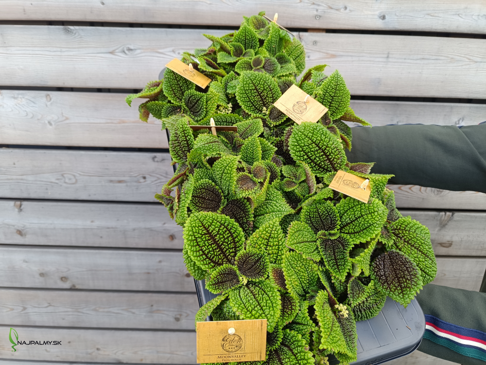 Pilea mollis ´MOON VALLEY´ je atraktívna rastlina s veľkými listami, ktoré sa vyznačujú výrazným zeleno-bielym vzorom, ktorý pripomína povrch mesiaca.